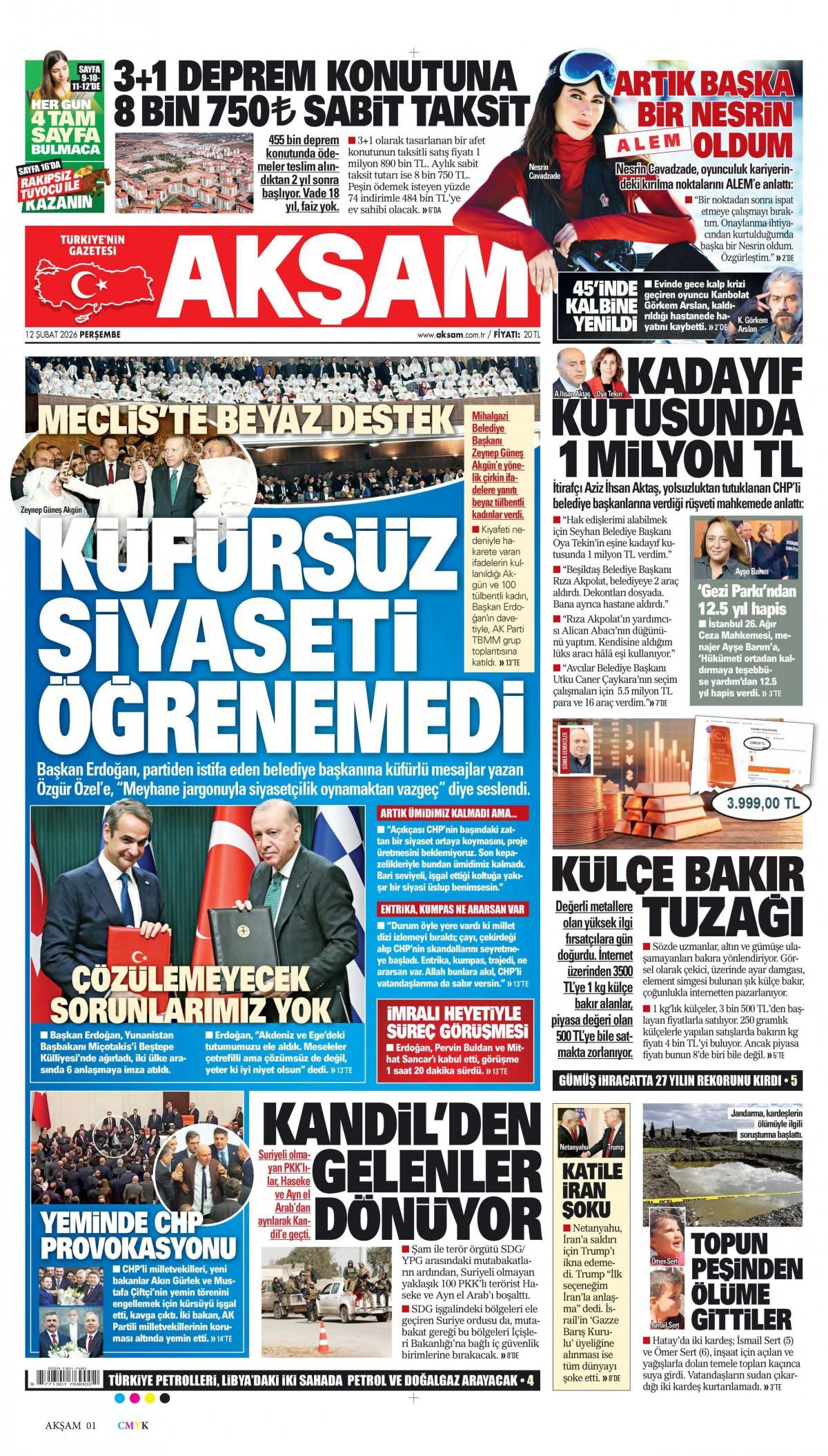 Akşam Gazetesi 13 Şubat 2026 Günü Gazete Manşetleri