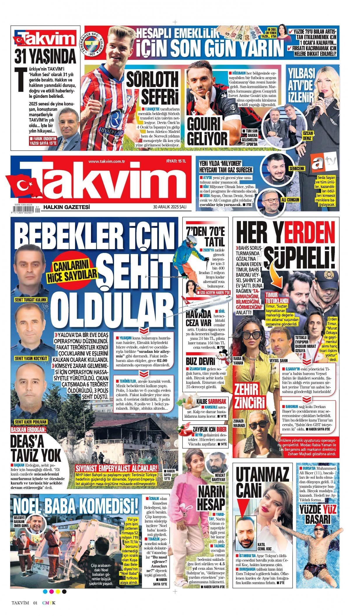 Takvim Gazetesi 30 Aralık 2025 Günü Gazete Manşetleri