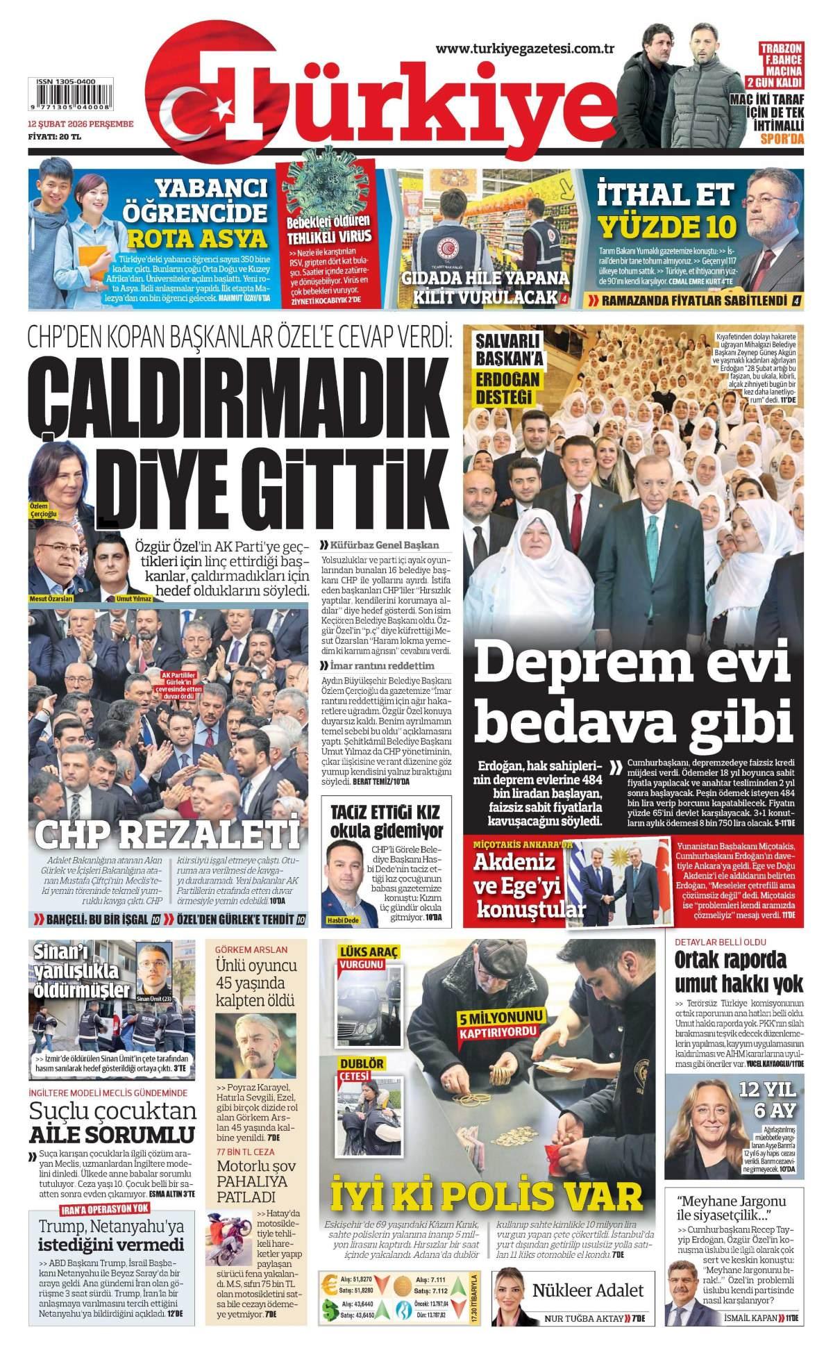Türkiye Gazetesi 13 Şubat 2026 Günü Gazete Manşetleri