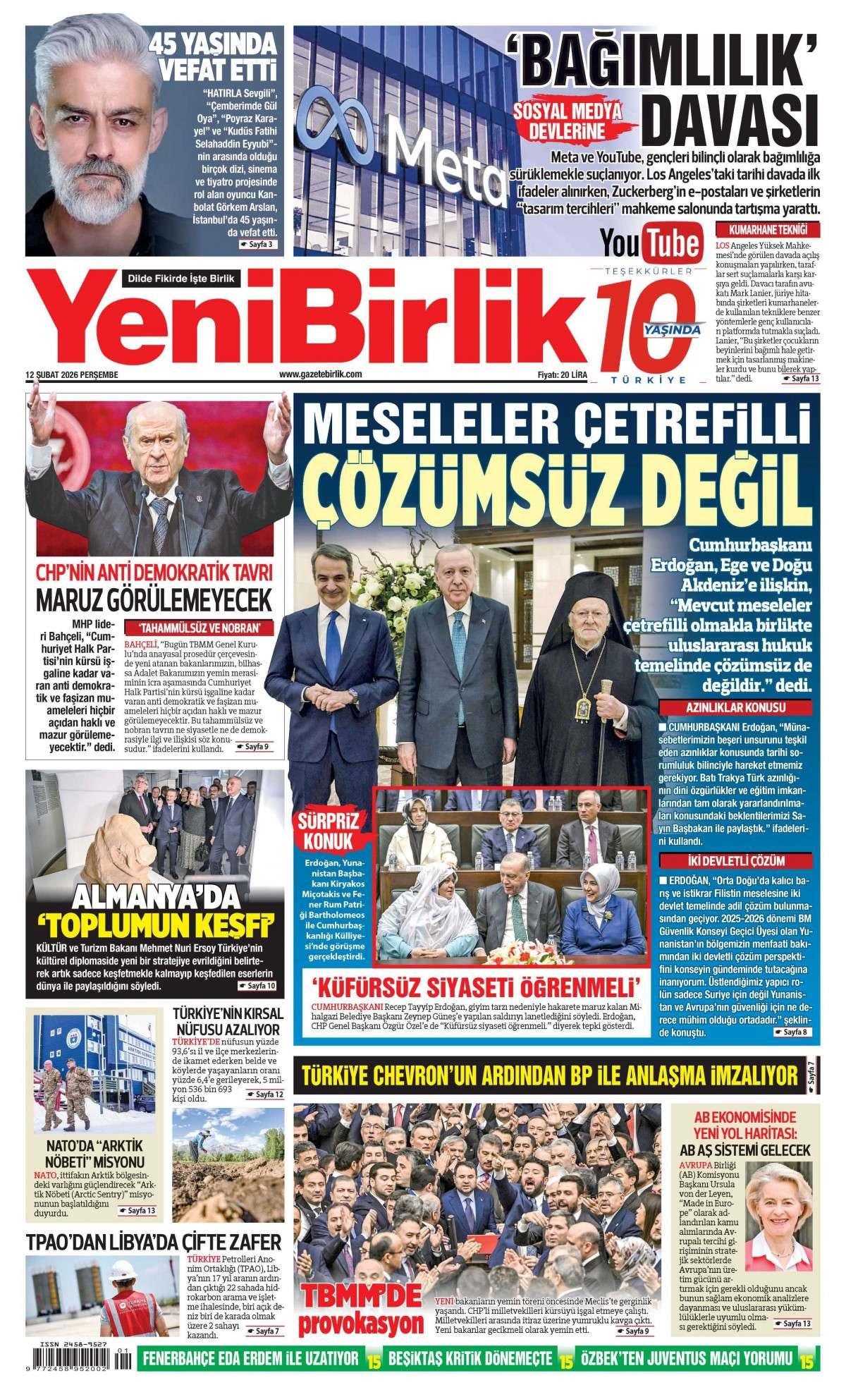 Yeni Birlik Gazetesi 13 Şubat 2026 Günü Gazete Manşetleri